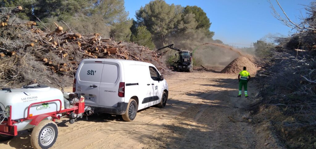 STV Gestión ha colaborado con Las Colinas Golf & Country Club (Orihuela, Alicante) en una actuación de economía circular: la transformación de los restos generados por la tala de cerca de 5.000 pinos, afectados por la sequía y la aparición de una plaga de Tomicus destruens, en un producto útil para el propio entorno.